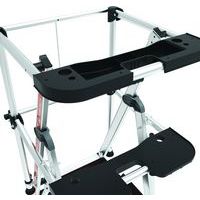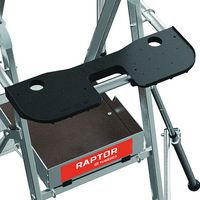 Platform met dubbel legbord Raptor. Stevige reling aan 4 kanten met liggers voor valbeveiliging met semi-automatische sluiting. Antisliptreden van 80 mm. Verwijderbare gereedschapshouder met vakindeling, belasting van 25 kg, met geïntegreerde haken (max. 10 kg). XL-legbord, belastbaar tot 25 kg. Antislipvloer 500 x 400 mm van hout uit duurzame bronnen. Ergonomische werkruimte. Intrekbare stabilisatoren met afstelling in millimeters.