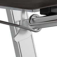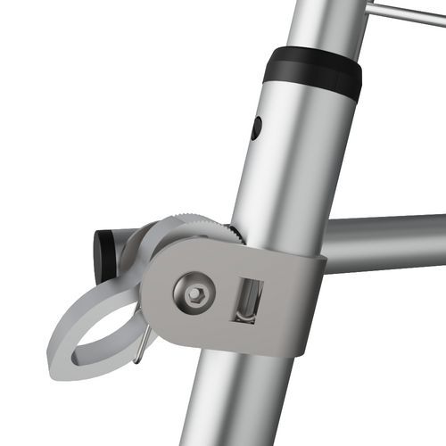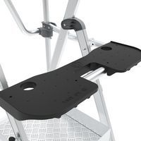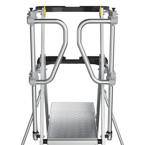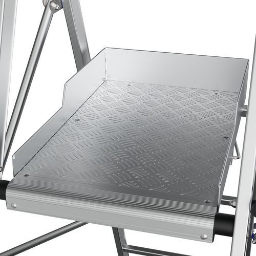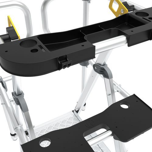 Platform Sherpamatic Saloon. Stevige reling aan 4 kanten met hekje type Saloon met automatische sluiting. Antisliptreden 80 mm (vast deel) en 60 mm (uitschuifbaar deel). Verwijderbare gereedschapshouder met vakindeling, belasting van 25 kg, geïntegreerde haken (max. 10 kg). XL-legbord, belastbaar tot 25 kg. Zeer comfortabele vloer 590 x 400 mm van aluminium met antisliplaag. Ergonomische en comfortabele werkruimte. Intrekbare stabilisatoren met afstelling in millimeters. Intuïtief en veilig systeem voor instelling van de hoogte, verstelbaar per 23 cm. Telescopische delen om de hoogte te verstellen.