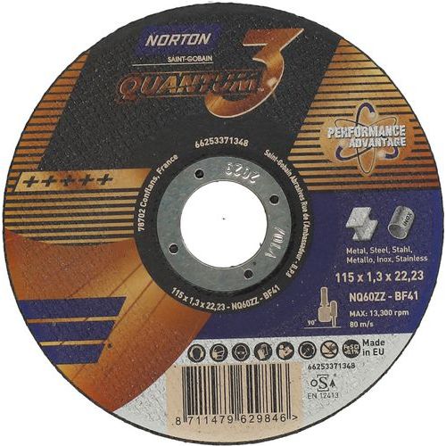 | Productnaam | Platte snijschijf Quantum 3, Boring diameter slijpsteen: 22.23 mm, Schuurmiddel: Keramiek, Korrel: 46 |