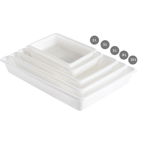 Multifunctionele platte bak voor voedingsmiddelen: bereiding, marinade, afgieting, ontdooiing, opslag van controlemonsters... Speciaal ontworpen voor de voedingsindustrie. Minimale opbergruimte, leeg in elkaar te stapelen. formaat geschikt voor koelkast.