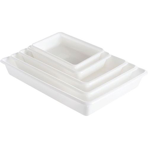 Multifunctionele platte bak voor voedingsmiddelen: bereiding, marinade, afgieting, ontdooiing, opslag van controlemonsters... Speciaal ontworpen voor de voedingsindustrie. Minimale opbergruimte, leeg in elkaar te stapelen. formaat geschikt voor koelkast.