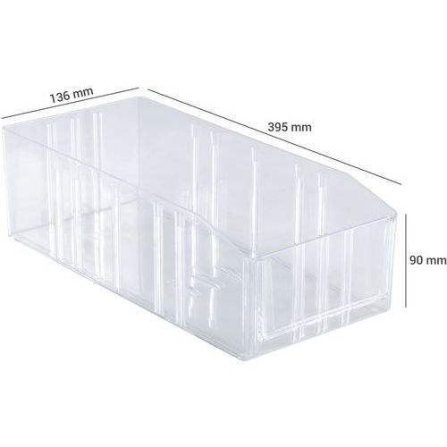 Zeer stevig. Indeelbare magazijnbak Verlaagde voorkant voor een betere zichtbaarheid van de inhoud. Gladde wanden en bodem. Hoge weerstand tegen zuren.