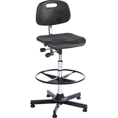 Een praktische en stevige werkstoel met zitting en rugleuning van schokdempend gegoten kunststof met schuim van gegoten polyurethaan.