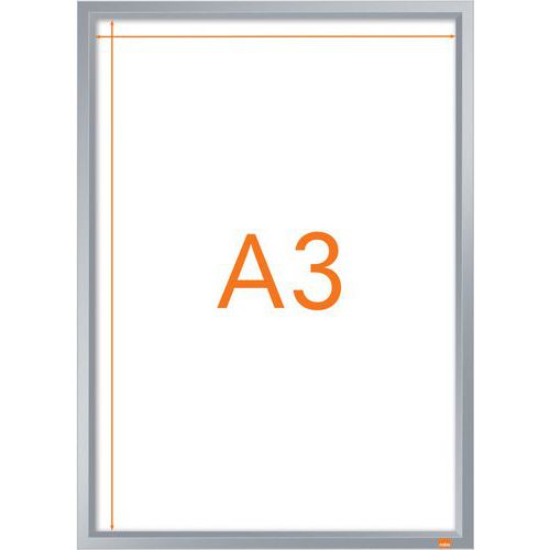 Wandgemonteerde poster clicklijst met een stijlvol, onopvallend frame, naadloze verstekhoeken. Weergave Formaat A3 of A4. Innovatief clicklijst mechanisme voor het vervangen van documenten. Biedt snelle en eenvoudige wisseling van de inhoud. Stabiele en veilige bevestiging door hoekmontage (inclusief bevestigingsmateriaal). Maak je eigen gratis te downloaden borden door een bezoek aan de Nobo Sign Maker website met meer dan 100 sjablonen.