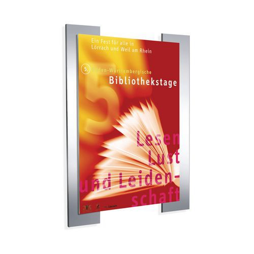 Posterhouder is voorzien van een stijlvol frame, in de vorm van 2 aluminium panelen. Door het postervak te openen kan de inhoud snel en eenvoudig verwisseld worden.