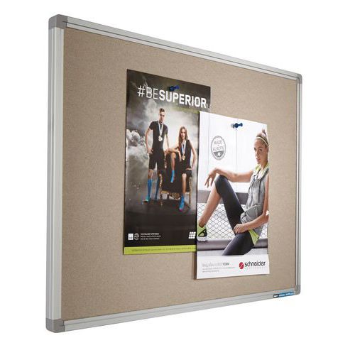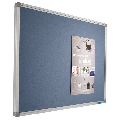 Prikbord van textiel. Hoogwaardig, 100% gerecycled oppervlak. Groot scala aan kleuren voor de achtergrond. Het materiaal is geanodiseerd aluminium van hoge kwaliteit. Rand met profielen en kunststof hoeken. Eenvoudig te onderhouden. Brandbestendig.