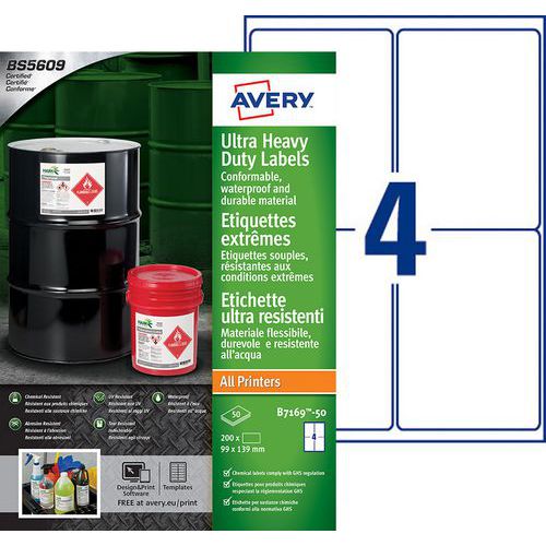 Soepel etiket met sterk hechtend vermogen, bestand tegen extreme omstandigheden. Rekbaar materiaal: geschikt voor markering op gebogen en/of ruwe oppervlakken. Bestand tegen temperaturen van -40 °C tot +150 °C, tegen vuil, chemische producten, oplosmiddelen, uv-stralen. Gecertificeerd BS5609 deel 2 (bestendigheid van het etiket en het kleefmiddel), en goedgekeurd voor het etiketteren van gevaarlijke chemische producten. Geschikt voor alle types inkjet- en laserprinters en kopieermachines.