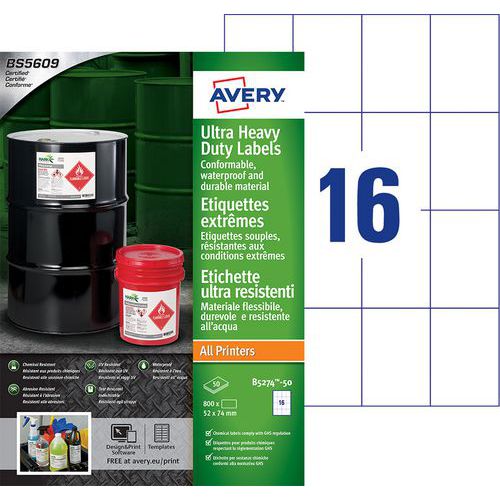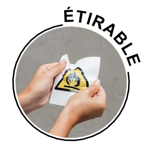 Soepel etiket met sterk hechtend vermogen, bestand tegen extreme omstandigheden. Rekbaar materiaal: geschikt voor markering op gebogen en/of ruwe oppervlakken. Bestand tegen temperaturen van -40 °C tot +150 °C, tegen vuil, chemische producten, oplosmiddelen, uv-stralen. Gecertificeerd BS5609 deel 2 (bestendigheid van het etiket en het kleefmiddel), en goedgekeurd voor het etiketteren van gevaarlijke chemische producten. Geschikt voor alle types inkjet- en laserprinters en kopieermachines.