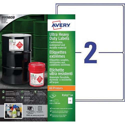 Soepel etiket met sterk hechtend vermogen, bestand tegen extreme omstandigheden. Rekbaar materiaal: geschikt voor markering op gebogen en/of ruwe oppervlakken. Bestand tegen temperaturen van -40 °C tot +150 °C, tegen vuil, chemische producten, oplosmiddelen, uv-stralen. Gecertificeerd BS5609 deel 2 (bestendigheid van het etiket en het kleefmiddel), en goedgekeurd voor het etiketteren van gevaarlijke chemische producten. Geschikt voor alle types inkjet- en laserprinters en kopieermachines.