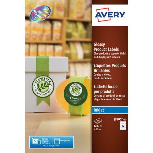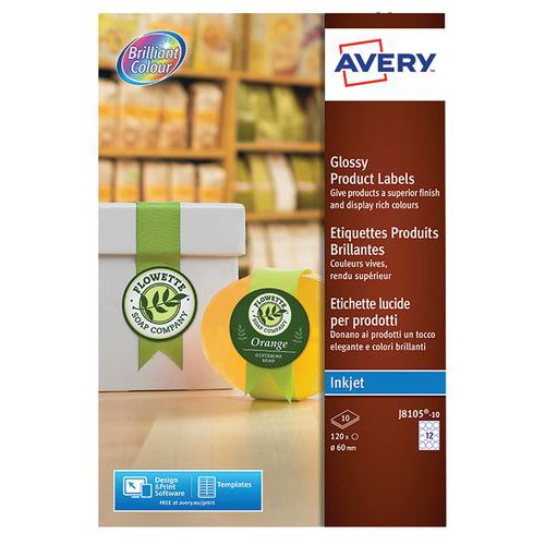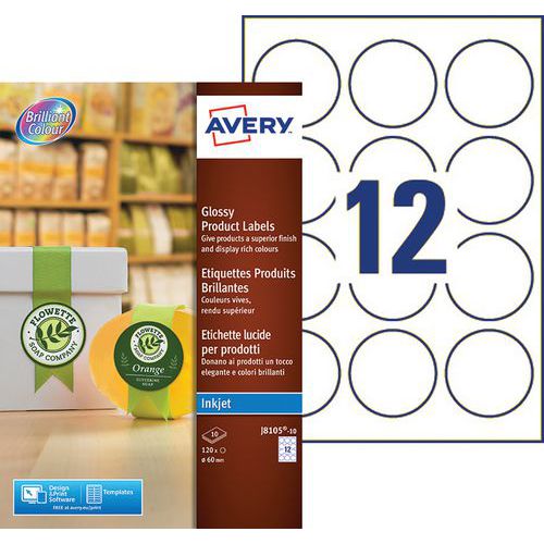 | Productnaam | Productetiket, Aantal etiketten/vel: 12, Aantal etiketten: 120, Ø: 60 mm, Type nr.: J8105, Kleur: Wit |