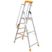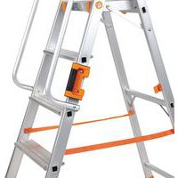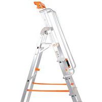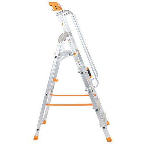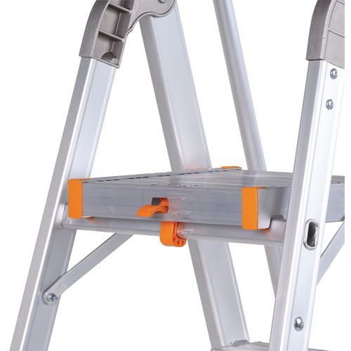 Professionele trap van aluminium. Multifunctioneel gereedschapsbord. Comfortabel en veilig dankzij de leuning. Verstevigde profielen van aluminium. Platform met vergrendelingssysteem. Antisliptreden. Eenvoudig te vervoeren en op te bergen.