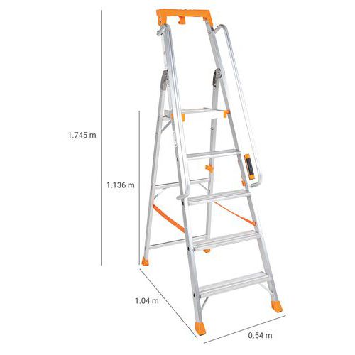 Professionele trap van aluminium. Multifunctioneel gereedschapsbord. Comfortabel en veilig dankzij de leuning. Verstevigde profielen van aluminium. Platform met vergrendelingssysteem. Antisliptreden. Eenvoudig te vervoeren en op te bergen. Klantgarantie : 10 jaar Max. belasting (kg) : 150