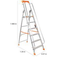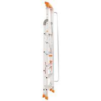 Professionele trap van aluminium. Multifunctioneel gereedschapsbord. Comfortabel en veilig dankzij de leuning. Verstevigde profielen van aluminium. Platform met vergrendelingssysteem. Antisliptreden. Eenvoudig te vervoeren en op te bergen.