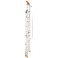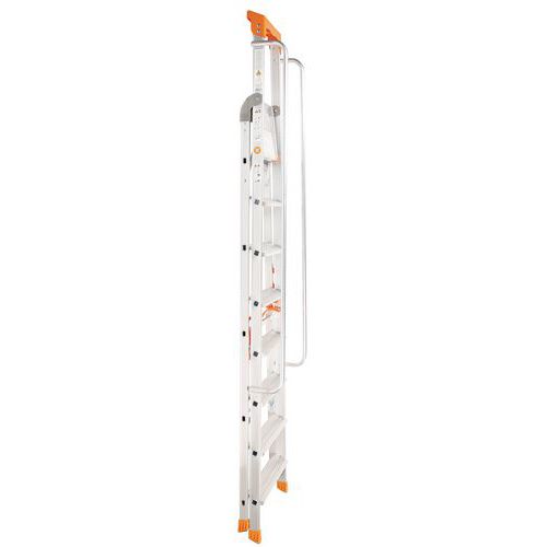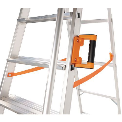 Professionele trap van aluminium. Multifunctioneel gereedschapsbord. Comfortabel en veilig dankzij de leuning. Verstevigde profielen van aluminium. Platform met vergrendelingssysteem. Antisliptreden. Eenvoudig te vervoeren en op te bergen.