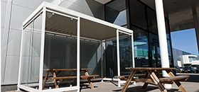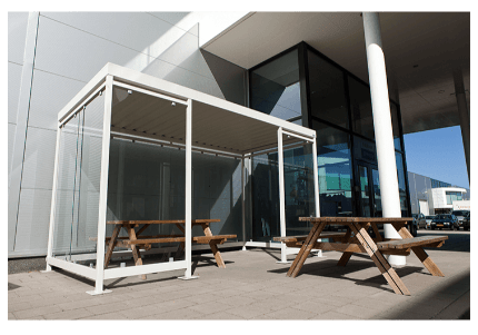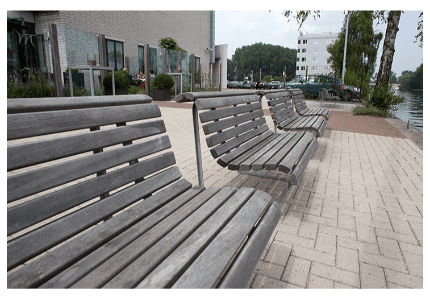 Een comfortabele zitgelegenheid die past in de stijl van het gebouw waar gasten heerlijk kunnen toeven bij mooi weer. Om eenheid te creëren is er gekozen voor buitenbanken die volledig duurzaam geproduceerd zijn. Daarbij werd specifiek gelet op een tijdloos design van de zitbanken, zodat dit aansluit bij de stijl van de rest van het bedrijf.