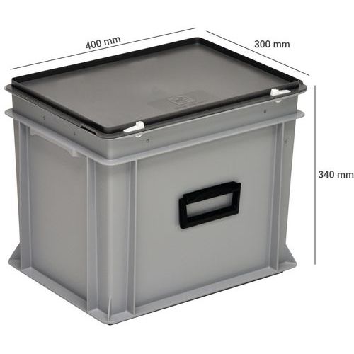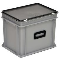 Rako Koffer bestaande uit een stapelbare Euronorm bak-bak, een deksel met scharnier en een handgreep aan de voorzijde van de koffer, op een grote zijde. Bovendien beschikken bepaalde koffers over twee etikethouders aan twee zijden, een grote en een kleine (35-3212-0, 35-4312-0, 35-4324-0, 35-6407-0, 35-6412-0, 35-6424-0) Afmetingen Europese norm. Stapelbare koffers in stapel. Gemaakt in de EU