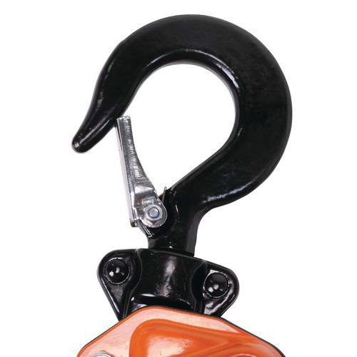 - Draaiende haken van gelegerd staal, gestampt met verf en uitgerust met gesmede veiligheidspallen.