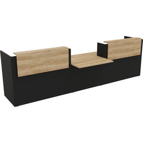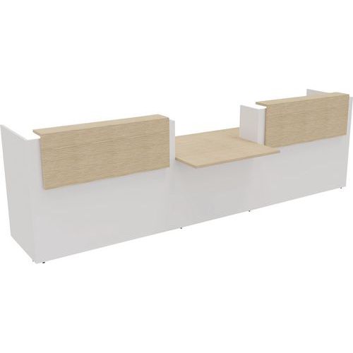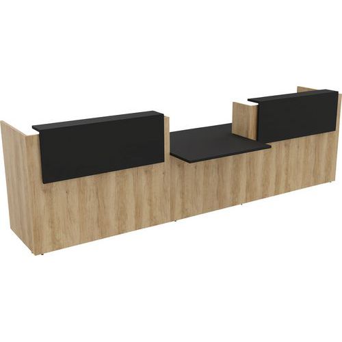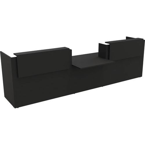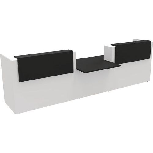 De receptiebalie Filia is perfect geschikt voor het ontvangen van mindervaliden. Autonoom of gecombineerd voor een gezellig onthaalpunt. Blad en paneel: Gemelamineerd paneel, dikte 25 mm. Schokbestendige ABS-randen van 2 mm. Voorgesneden plaat voor de doorgang van voedingskabels. Gemelamineerd paneel met een dikte van 38 minuten, in afkortlegbaar op een hoek van 45 ° en als welkomstscherm voor bezoekers.