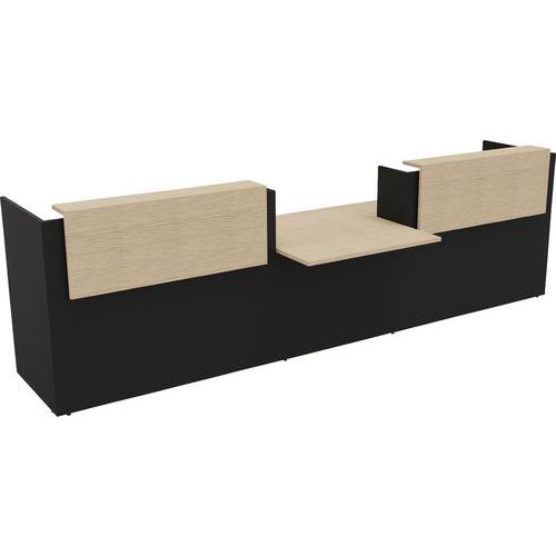De receptiebalie Filia is perfect geschikt voor het ontvangen van mindervaliden. Autonoom of gecombineerd voor een gezellig onthaalpunt. Blad en paneel: Gemelamineerd paneel, dikte 25 mm. Schokbestendige ABS-randen van 2 mm. Voorgesneden plaat voor de doorgang van voedingskabels. Gemelamineerd paneel met een dikte van 38 minuten, in afkortlegbaar op een hoek van 45 ° en als welkomstscherm voor bezoekers.