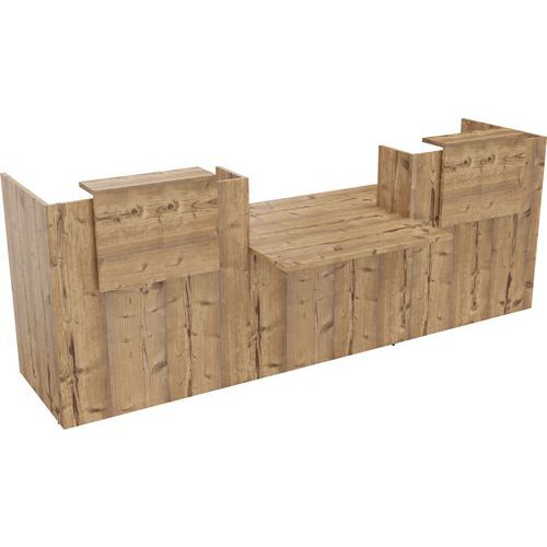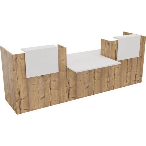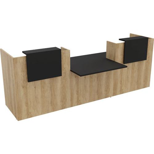 De receptiebalie Filia is perfect geschikt voor mindervalide bezoekers. Deze balie kan afzonderlijk of gecombineerd gebruikt worden en heeft een gastvrije uitstraling. Blad en paneel: Gemelamineerd paneel, dikte 25 mm. Schokbestendige ABS-randen van 2 mm. Voorgesneden plaat voor de doorgang van voedingskabels. Gemelamineerd paneel met een dikte van 38 minuten, in afkortlegbaar op een hoek van 45 ° en als welkomstscherm voor bezoekers.