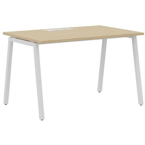 Recht bureau met boogvormige A-poten. Melamineblad van 25 mm dikte met randen van ABS van 2 mm. 10 mm tussen de poten en het bureau. 2 Metalen dwarsliggers voor bevestiging (40 x 20 mm) Metalen buisvormige poot (40 x 40 mm) en kunststof vijzels voor nivellering (+10 mm). Blad met uitsparing voor kabeldoorvoer met afsluiter.