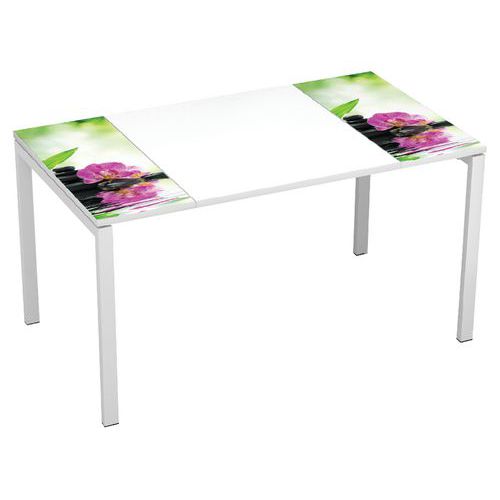 Recht bureau 140x80 cm met blad Décor Easy Office. Metalen structuur voor een perfecte stevigheid. Telescopische metalen balken. Randen van PVC, dikte 2 mm. Metalen voet met doorsnede 50 x 30 mm. Afgewerkt met witte epoxylak. Gepersonaliseerd en snel geïnstalleerd.