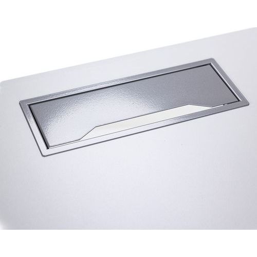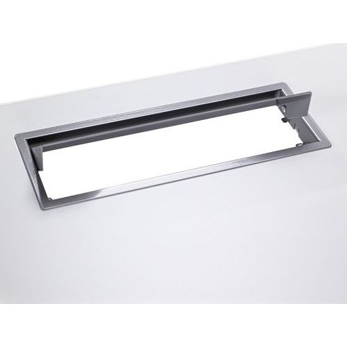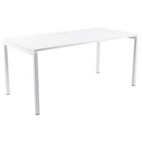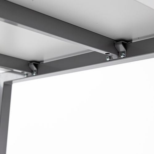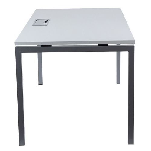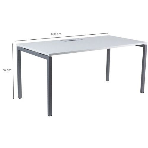 Recht bureau met melamineblad van 25 mm en randen van ABS van 2 mm. 2 Buisvormige metalen dwarsliggers voor bevestiging van 40 x 20 mm. Rechte poten met metalen structuur 40x40 mm en kunststof poten voor nivellering. Het blad heeft een kabeldoorgang met afsluiter voor het organiseren van de kabels.