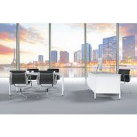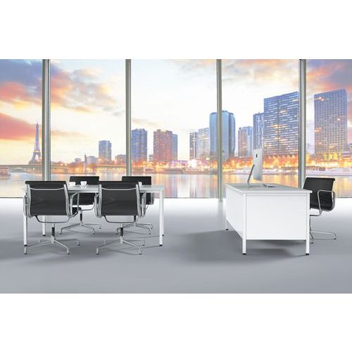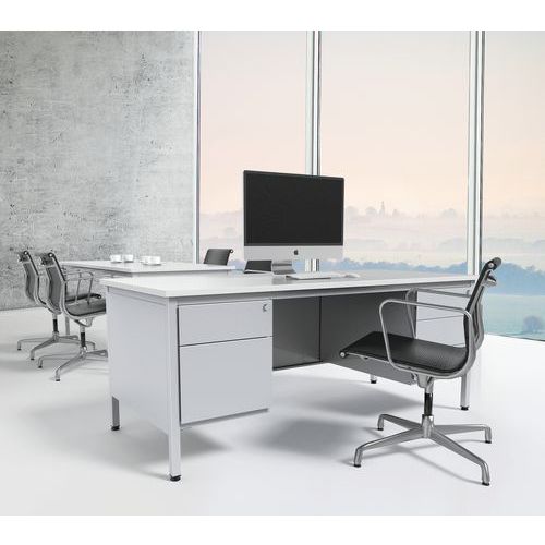 Stevig, tijdloos bureau. Bijzonder stevig, ontspiegeld blad (dikte 25 mm). Centrale vergrendeling van het ladeblok. Het ladenblok kan links of rechts worden geplaatst. Onderstel met stelpoten. Zelfdragend frame en metalen frontpaneel onder het werkblad.