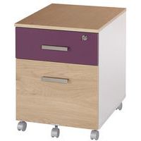 Houten constructie van spaanplaat, gemelamineerd. Plateaudikte 25 mm. In hoogte verstelbaar in 3 standen (72,5 75,5 82 cm) te kiezen tijdens de montage van het bureau. Frontpaneel dikte 16 mm wit decor. Wangen wit decor, met gekleurde verbindingsstukken. Ladeblokken met toplaag in licht eiken, zijkanten wit en 1e lade in kleur. 1e lade met sleutelslot (2 sleutels meegeleverd). L/H/D: 42 x 56 x 53 cm. Meubel monteerklaar geleverd met handleiding