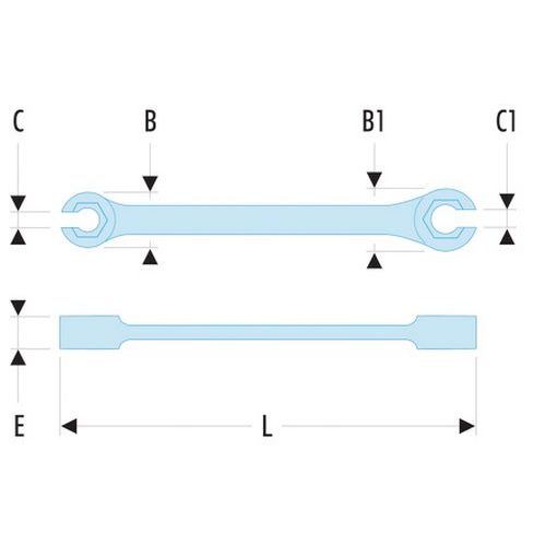 Leidingsleutels met plaatstaal: de kop is verstevigd met plaatstaal, voor vast- en losdraaien met grote kracht. Voorbeelden: remslangen, verstuivermoer. Het plaatstaal houdt de sleutel ook op de moer. Korte handgreep voor een betere hanteerbaarheid. Metrische maten: van 7 tot 19 mm. Uiterlijk: verchroomd gesatineerd.