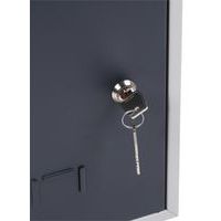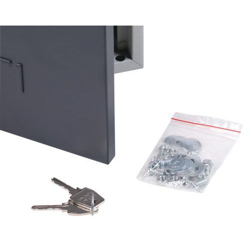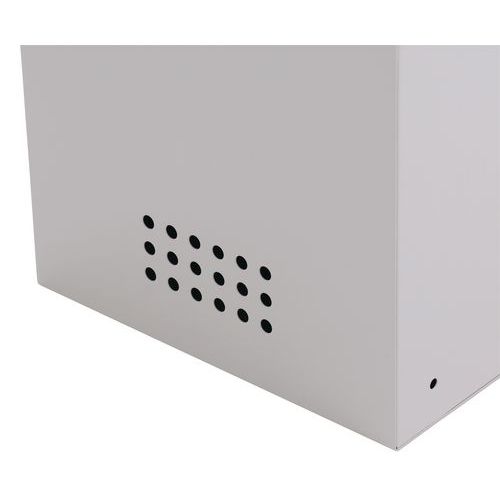 Opbergvak met voorgeboorde gaten voor montage. Esthetische afwerking met onzichtbaar scharnier aan de voorzijde. Comfortabel met deur die tot 180° te openen is. Vak met ruimte voor etikethouders. Afsluitbaar met cilinderslot.