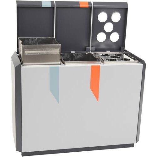 - Brandveilige afvalscheidingsunit van hoogwaardig aluminium met 3 binnenemmers waarvan één met bekerinzet.