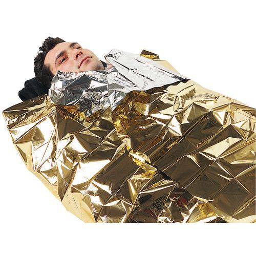 - Deze is gemaakt van gemetalliseerd polyester en is onmisbaar voor eerste hulp aan gewonden, door beschermen te bieden tegen hitte (zilverkleurige kant buiten), kou en weersinvloeden (goudkleurige kant buiten). Deze deken is ook geschikt voor kamperen, bivakkeren, alpinisme, skiën, watersporten, enz.