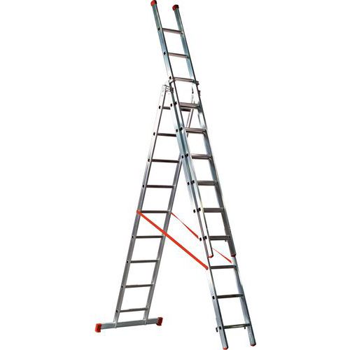 - 3-delige reformladder met wijduitlopende basis voor een betere stabiliteit op oneffen terrein. Scharnieren vastgeschroefd op het profiel. Eenvoudig te openen ladder dankzij een geïntegreerde geleideas. Platen van polypropyleen voor het soepel en moeiteloos schuiven van de delen. Grote antislipdoppen.