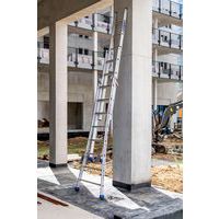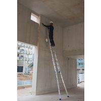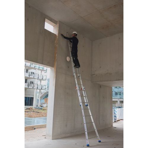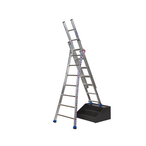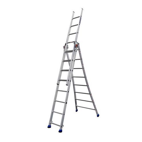 3-delige reformladder met wijduitlopende basis voor een betere stabiliteit op oneffen terrein. Scharnieren vastgeschroefd op het profiel. Eenvoudig te openen ladder dankzij een geïntegreerde geleideas. Platen van polypropyleen voor het soepel en moeiteloos schuiven van de delen. Grote antislipdoppen.