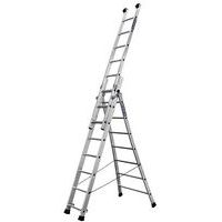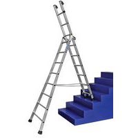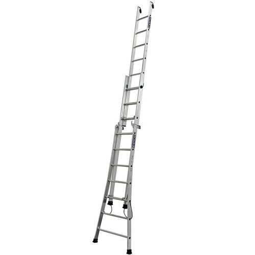 3-delige reformladder met wijduitlopende basis om oneffenheden in de ondergrond te compenseren en obstakels te overbruggen. Scharnieren van gegoten aluminium. Eenvoudig te openen ladder dankzij een geïntegreerde geleideas. Voorzien van wandvoeten om de oppervlakken te beschermen waartegen de ladder steunt. Stalen haken met vergrendeling houden de delen op hun plaats. Banden voor spreidbeveiliging en meer stabiliteit. Over de uiteinden geschoven antislipvoeten. Eenvoudig en zonder gereedschap te verwisselen. Ladderbevestiging en wandafstandhouder verkrijgbaar als accessoires. Franse makelij. Brede gesloten aluminium profielen. Klantgarantie : 5 jaar Max. belasting (kg) : 150