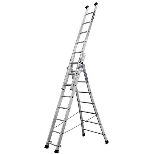 3-delige reformladder met wijduitlopende basis om oneffenheden in de ondergrond te compenseren en obstakels te overbruggen. Scharnieren van gegoten aluminium. Eenvoudig te openen ladder dankzij een geïntegreerde geleideas. Voorzien van wandvoeten om de oppervlakken te beschermen waartegen de ladder steunt. Stalen haken met vergrendeling houden de delen op hun plaats. Banden voor spreidbeveiliging en meer stabiliteit. Over de uiteinden geschoven antislipvoeten. Eenvoudig en zonder gereedschap te verwisselen. Ladderbevestiging en wandafstandhouder verkrijgbaar als accessoires. Franse makelij. Brede gesloten aluminium profielen.