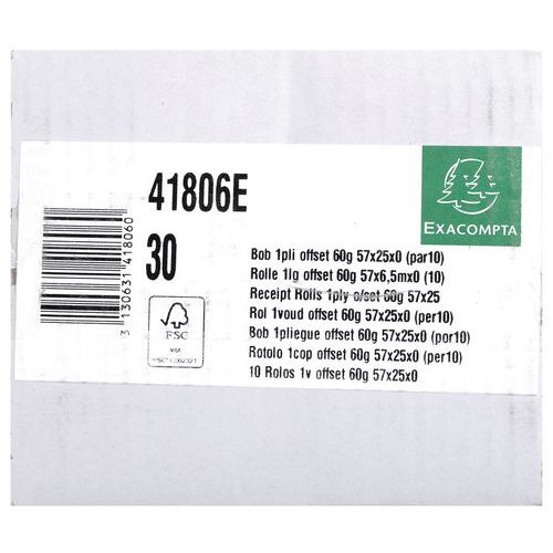 | Productnaam | Rekenmachine rol 57x25x0x6.5 1 laag offset extra wit 60g/m2 Exacompta, Type: Bobines pour machines à calculer |