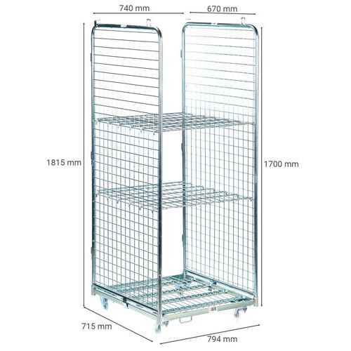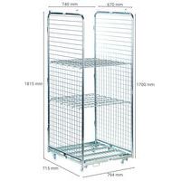 Rolcontainer 2 zijden met 2 legborden, Max. belasting: 400 kg, Totale hoogte: 1815 mm, Totale lengte: 794 mm