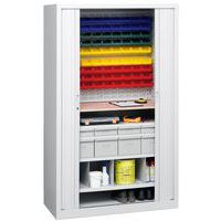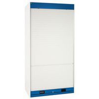 Stevige materiaalkast in gelast plaatstaal met handige sleuvenachterpaneel. Bespaar ruimte dankzij de PVC roldeuren (klasse M1). Geschikt voor uw zware producten door verstevigde sokkel. Verstel uw legborden eenvoudig per 25 mm in hoogte. Af te sluiten met ingebouwd slot. Ideaal voor het ophangen van bakken aan het achterpaneel Toon meer Toon minder