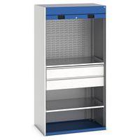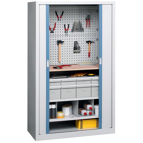 Stevige materiaalkast in gelast plaatstaal met handige perfoachterpaneel. Bespaar ruimte dankzij de PVC roldeuren (klasse M1). Geschikt voor uw zware producten door verstevigde sokkel. Verstel uw legborden eenvoudig per 25 mm in hoogte. Af te sluiten met ingebouwd slot. Ideaal voor het ophangen van uw gereedschap aan het achterpaneel Toon meer Toon minder