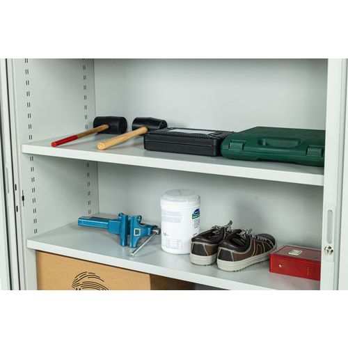 Ervaar het gebruiksgemak van deze extra brede compacte hoge kast. Verstel de legborden en gebruik ze ook voor hangmappen. Met krasbestendige epoxy-afwerking. Sluit de kunststof roldeur af met het cilinderslot. Veiligheidstips: - Plaats het meubel op een vlak oppervlak - Bevestig het aan de muur of een scheidingswand met een speciale bevestiging - Let erop dat u de aanbevolen maximale belasting niet overschrijdt en zorg voor een goede verdeling Klantgarantie : 10 jaar Max. belasting per legbord (kg) : 45 Brandveiligheid : M1