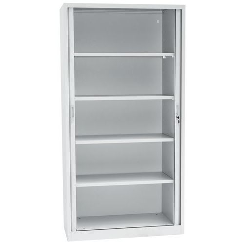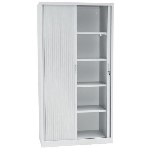 Ervaar het gebruiksgemak van deze extra brede compacte hoge kast. Verstel de legborden en gebruik ze ook voor hangmappen. Met krasbestendige epoxy-afwerking. Sluit de kunststof roldeur af met het cilinderslot.