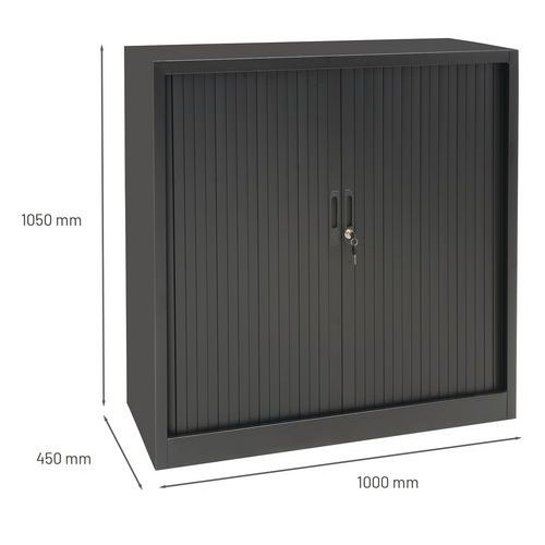 Ervaar het gebruiksgemak van deze compacte lage kast. Verstel het legbord en gebruik het ook voor hangmappen. Let op de krasbestendige poedercoating. Sluit de kunststof roldeur af met het cilinderslot. De kast heeft een frame met dikte van 0,7 mm. Veiligheidsadvies: - plaats het meubel op een vlak oppervlak - bevestiging aan de muur of een scheidingswand met geschikt bevestigingsmateriaal - respecteer de aanbevolen maximale belasting en zorg voor een goede gewichtsverdeling