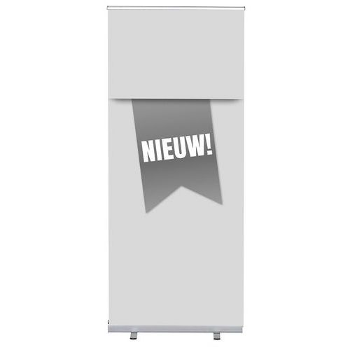 De Roll-Banner is een lichtgewicht cassette met inhoudsopdruk, die na gebruik eenvoudig kan worden opgerold en ingepakt.