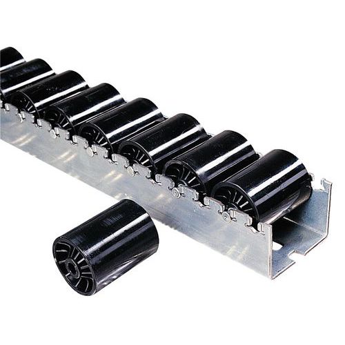 Kunststof rollenband voor zware lasten, lengte 2400 mm. Permanent gesmeerde gegalvaniseerde as in glad lager. Rail met draagprofiel dat per 24 mm is doorboord voor bevestiging.