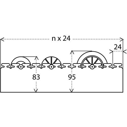 Kunststof rollenband voor zware lasten, lengte 2400 mm. Permanent gesmeerde gegalvaniseerde as in glad lager. Rail met draagprofiel dat per 24 mm is doorboord voor bevestiging. Gemaakt in Duitsland Klantgarantie : 3 jaar Max. belasting (kg/m²) : 600