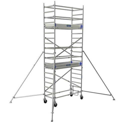 Rolsteiger, gelaste aluminium constructie, dubbele gladde reling. Verwijderbare plinten van aluminium (150 mm), snel te plaatsen. Verstelbare antislip-grondplaat voor stabilisator, met geïntegreerde niveaustop. Wielen met zeer krachtige blokkering, verstelbaar in millimeters over 200 mm, steeds per 12,5 mm. Gepatenteerd Ergoblok®-verbindingssysteem voor een zeer betrouwbare blokkering in één beweging. Vloer type R08 Comabi.