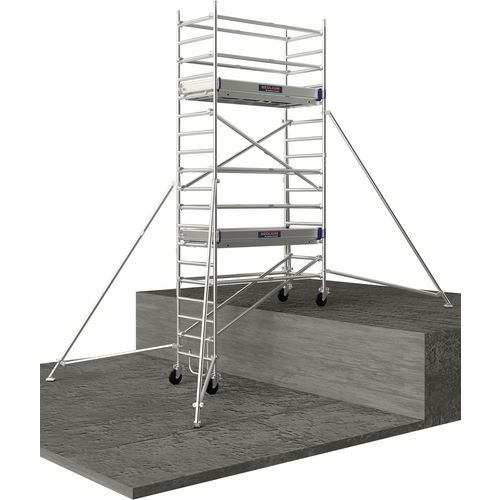 Rolsteiger, gelaste aluminium constructie, dubbele gladde reling. Verwijderbare plinten van aluminium (150 mm), snel te plaatsen. Verstelbare antislip-grondplaat voor stabilisator, met geïntegreerde niveaustop. Wielen met zeer krachtige blokkering, verstelbaar in millimeters over 200 mm, steeds per 12,5 mm. Gepatenteerd Ergoblok®-verbindingssysteem voor een zeer betrouwbare blokkering in één beweging. Vloer type R08 Comabi. Gemaakt in de EU Max. belasting (kg) : 200