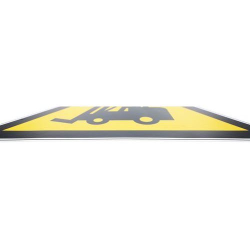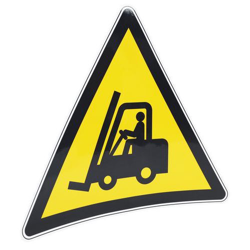 Signalering die wijst op het gevaar van rondrijdende industriële voertuigen, zoals heftrucks of laad- en losvoertuigen. Rond bord. Wijs op de aanwezigheid van deze voertuigen met behulp van dit bord met pictogram. U kunt zo het risico op ongevallen in uw magazijnen direct beperken door een verbeterd beheer van voetgangerszones en voertuigzones. Te verlijmen op elk glad, schoon en ontvet oppervlak.